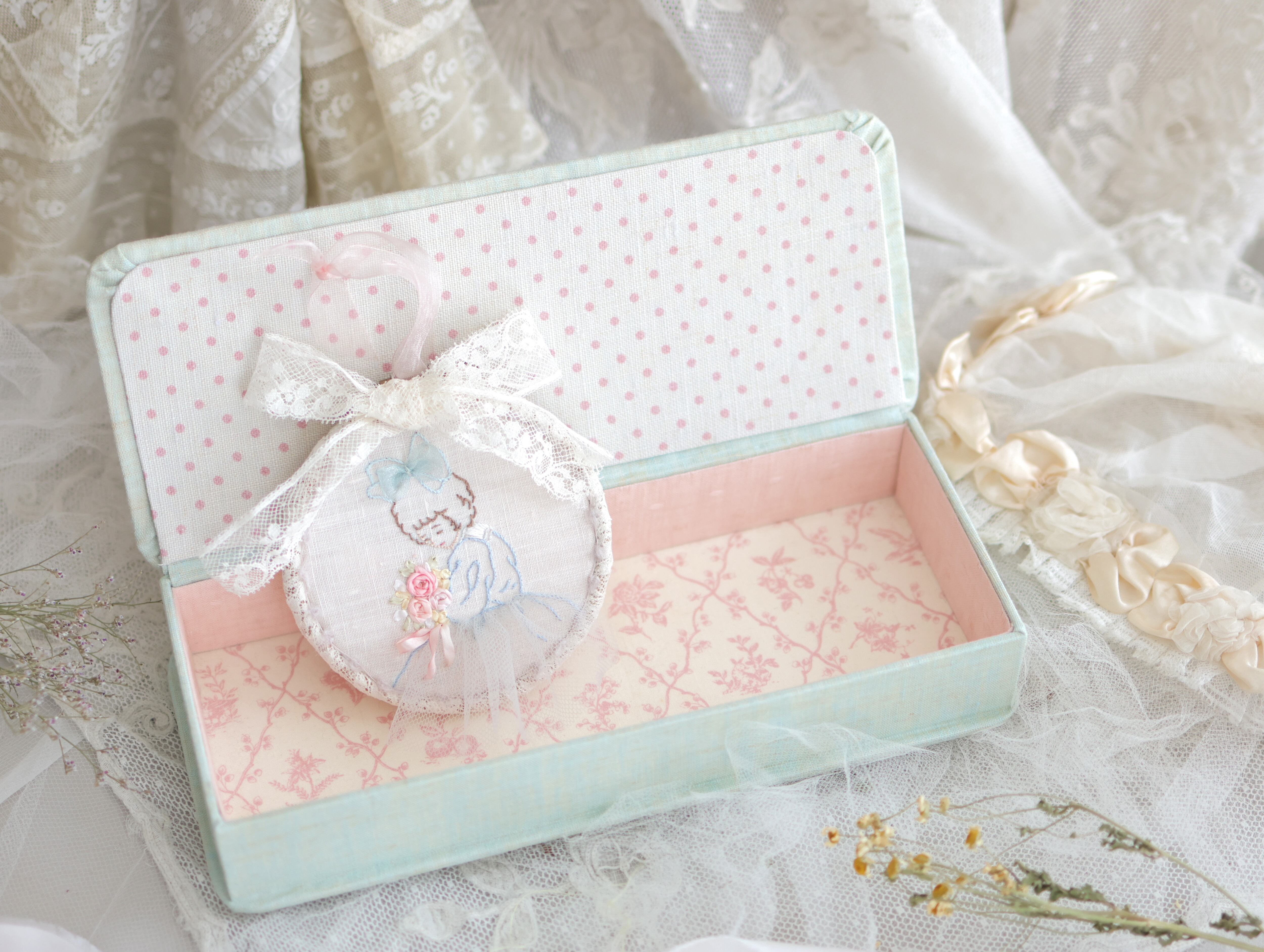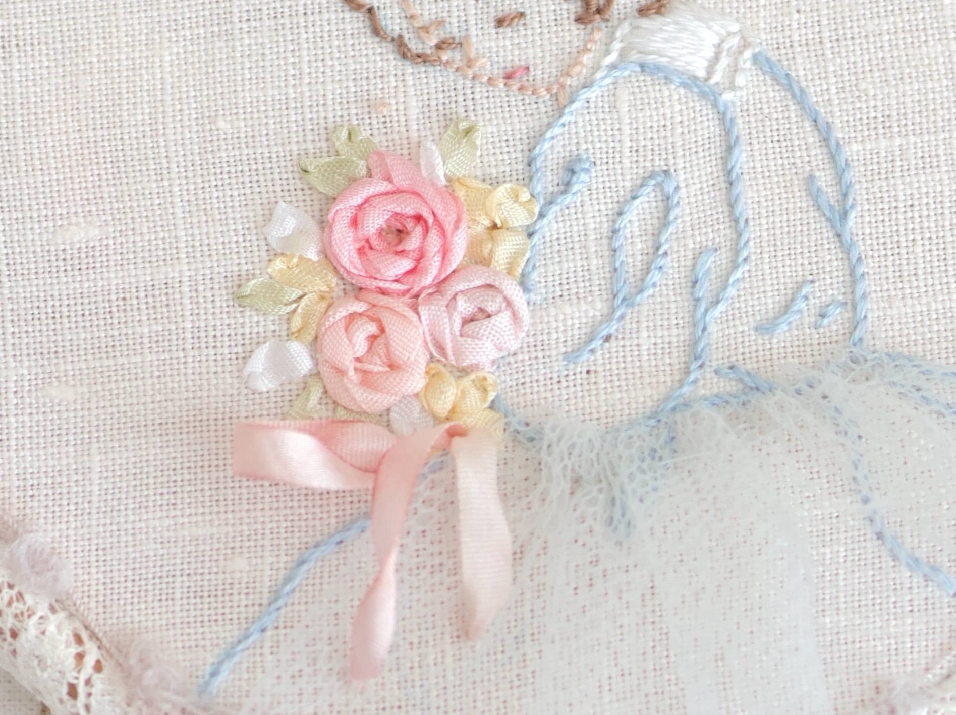 クレアちゃんが持っているローズブーケ部分をリボン刺しゅうしていただきます。