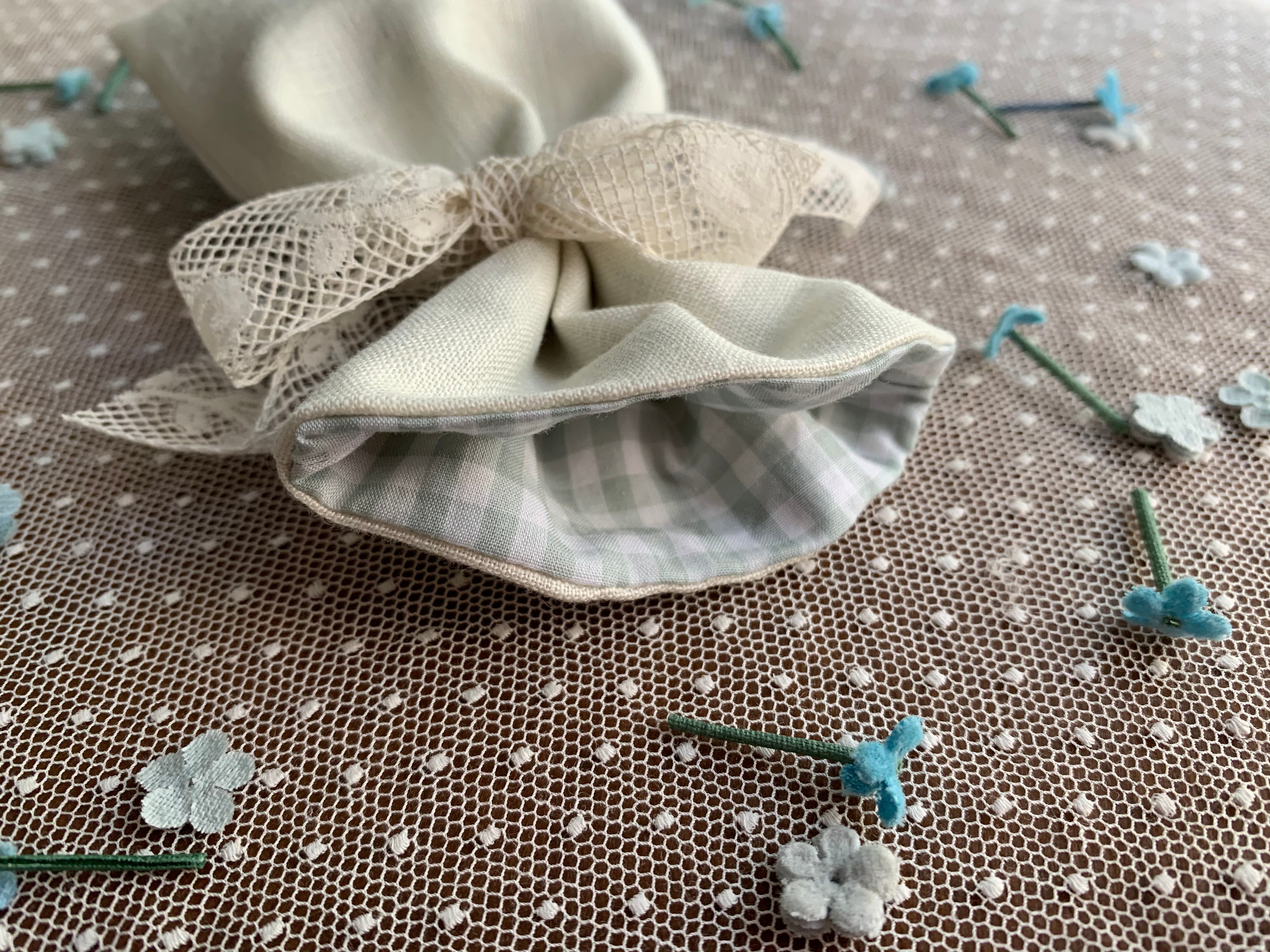 勿忘草のイニシャルを刺繍したラベンダーのサシェです。